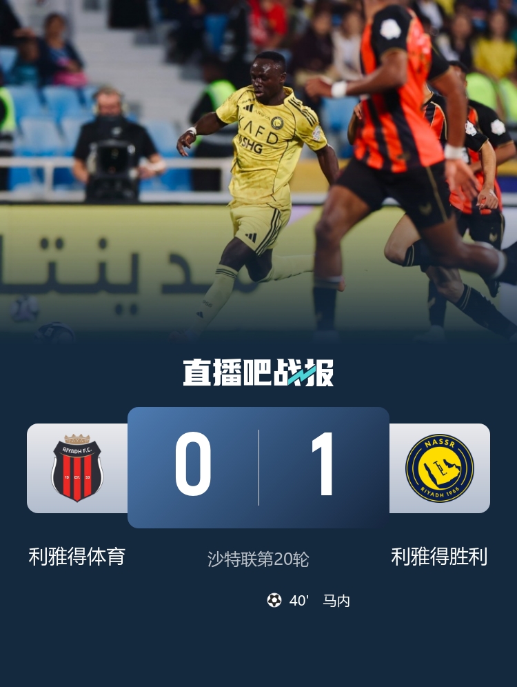 落后新月1分!利雅得胜利1-0利雅得体育 马内制胜C罗缺阵